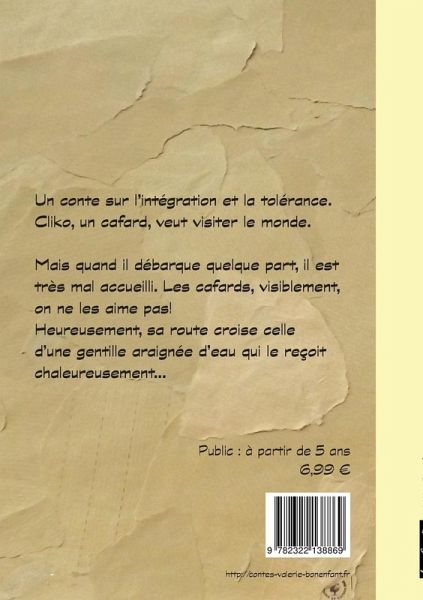Un beau livre sur la différence et la tolérance...Cliko, un cafard, veut visiter le monde.Mais quand il débarque quelque part, il est très mal accueilli. Les cafards, visiblement, on ne les aime pas ! Heureusement, sa route croise celle d'une gentille araignée d'eau, qui le reçoit chaleureusement...Pour illustrer cette belle histoire, des images différentes, créatives, librement inspirées : du relief, des couleurs, des formes découpées... Admirez le travail de l'artiste Pamela Reuss ! C'est étonnant, surprenant et très beau...Livre n°21 de la collection "Les contes de Valérie Bonenfant", dont la vocation est :- d'offrir du beau, de la poésie, de la douceur au monde...- de susciter chez le lecteur, jeune et moins jeune, l'imaginaire, le rêve, l'émotion...- de porter l'expression libre d'artistes de tous horizons : illustrateurs, graphistes, peintres, artistes urbains, mais aussi photographes, designers, architectes...Chaque livre est une pièce unique, porteuse d'art, de créativité, d'authenticité. Léger, il s'emmène facilement avec soi, mais est aussi digne de siéger en bibliothèque.- Format A5, 32 pages, illustrations couleur.- Public : tout âge, à partir de 5 ans.- Site internet : http://contes-valerie-bonenfant.fr