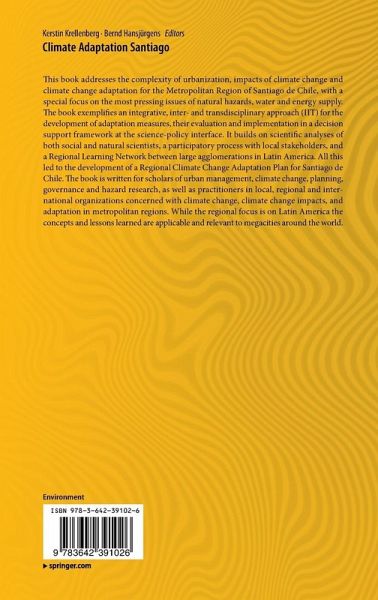 Preface.- Part I: Challenges for Urban Climate Change Adaptation.- Part II: Climate Change Impacts on the Urban-Regional level of Santiago de Chile.- Part III: Climate Change Impacts on Urban-Regional Level of Santiago de Chile: Key Sectors and Vulnerabilities.- Part IV: Adaptation Strategy: Developing Measures and Implementation.