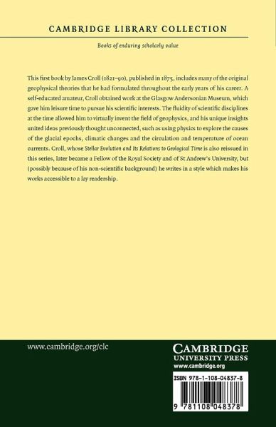 This first book by James Croll (1821-90), published in 1875, includes many of the original geophysical theories that he had formulated throughout the early years of his career. A self-educated amateur, Croll obtained work at the Glasgow Andersonian Museum, which gave him leisure time to pursue his scientific interests. The fluidity of scientific disciplines at the time allowed him to virtually invent the field of geophysics, and his unique insights united ideas previously thought unconnected, such as using physics to explore the causes of the glacial epochs, climatic changes and the circulation and temperature of ocean currents. Croll, whose Stellar Evolution and its Relations to Geological Time is also reissued in this series, later became a Fellow of the Royal Society and of St Andrew's University, but (possibly because of his non-scientific background) he writes in a style which makes his works accessible to a lay readership.