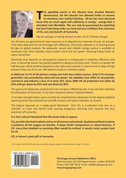 The appalling events in the Ukraine have shocked Western democracies. Yet this disaster has allowed reality to assume its dominion over wishful thinking. All but the most obsessed will know that we must regain self sufficiency in energy - energy that is abundant and affordable. This can only be guaranteed by exploiting the fossil fuels that lie under the surface of our land and seas in the knowledge that emissions of CO2 can only be of benefit to all humanity. We are paying a crushing ransom to the cult of 'Climate Change'. For 20 years our governments have prescribed and enforced the abandoning of our own reserves of coal, oil and gas for generation of electricity. They have deprived the UK of energy self sufficiency. They have exposed us to uncontrollable soaring prices for gas on global markets. No adequate, secure and reliable energy source is available at economic cost. Vast subsidies alone sustain wind and sun power imposing heavy levies on all households. Electricity that depends on atmospheric pressure is inadequate both in reliability, efficiency and cost. It cannot be stored. Sun panels depend on absence of cloud cover. There is no power for half the year. Wind turbines depend on the right wind velocity. In storms and on days of high pressure they are of no use. We depend on gas to maintain supply. Biomass combustion is carbon based. It burns wood and wood residues, agricultural residues, waste from industry, farms and households. There is no reduction in emissions. It is all imported. 20 train loads of pellet arrive daily at the Drax power plant alone. In 2020 just 13.7% of UK primary energy was from low carbon sources1. Only 4.7% of power generation was provided by wind and sun power. Yet subsidies now inflict on households, commerce and industry a levy of at least 25%. Since 2000 UK oil production has fallen by 62% with gas down by 65% and coal down by 94%. This grave and desperate predicament has not been inflicted by war. It has not been dictated by exhaustion of resources. It has been imposed without national debate. It has been brought down upon us solely by unquestioned submission to the dogma of global warming which has banished all scientific enquiry and which tolerates no dissent. It depends on a single great falsehood - that CO2 is a pollutant that acts as a 'blanket' to 'trap' the Earth's heat causing dangerous warming that imperils the very existence of humanity. It is that colossal falsehood that this book seeks to expose. CO2 provides the food of plants and so of all humans and animals. By photosynthesis in plants it produces all the oxygen we breathe. It keeps Earth's temperature in natural balance. If CO2 more than doubled no warming effect would be noticed. It would create surplus food for all. CO2 is Nature's great gift to humanity.