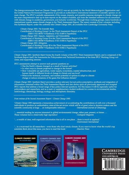 The Climate Change 2001 volumes of the Third Assessment Report of the IPCC provide the most comprehensive assessment of climate change since its second report, Climate Change 1995. This Synthesis Report provides a policy-relevant, but not policy-prescriptive, synthesis and integration of information contained within the Third Assessment Report and also draws upon all previously approved and accepted IPCC reports that address a broad range of key policy-relevant questions. For this reason it will be especially useful for policy makers and researchers, and as a main or supplementary student textbook for courses in environmental studies, meteorology, climatology, biology, ecology, and atmospheric chemistry.