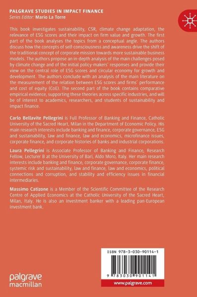 This book investigates sustainability, CSR, climate change adaptation, the relevance of ESG scores and their impact on firm value and growth. The first part of the book analyses the topics from a conceptual angle. The authors discuss how the concepts of self-consciousness and awareness drive the shift of the traditional concept of corporate mission towards more sustainable business models. The authors propose an in-depth analysis of the main challenges posed by climate change and of the initial policy-makers' responses and provide their view on the central role of ESG scores and circular economy for growth and development. The authors conclude with an analysis of the main literature on the measurement of the relation between ESG scores and firms' performance and cost of equity (CoE). The second part of the book contains comparative empirical evidence, supporting these theories across specific industries, and will be of interest to academics, researchers, and students of sustainability and impact finance.