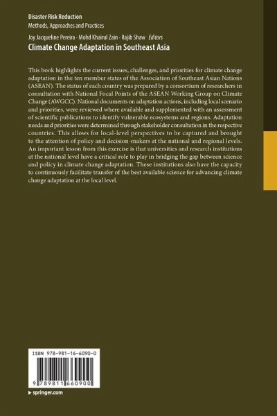 This book highlights the current issues, challenges, and priorities for climate change adaptation in the ten member states of the Association of Southeast Asian Nations (ASEAN). The status of each country was prepared by a consortium of researchers in consultation with National Focal Points of the ASEAN Working Group on Climate Change (AWGCC). National documents on adaptation actions, including local scenario and priorities, were reviewed where available and supplemented with an assessment of scientific publications to identify vulnerable ecosystems and regions. Adaptation needs and priorities were determined through stakeholder consultation in the respective countries. This allows for local-level perspectives to be captured and brought to the attention of policy and decision-makers at the national and regional levels. An important lesson from this exercise is that universities and research institutions at the national level have a critical role to play in bridging the gap between science and policy in climate change adaptation. These institutions also have the capacity to continuously facilitate transfer of the best available science for advancing climate change adaptation at the local level.