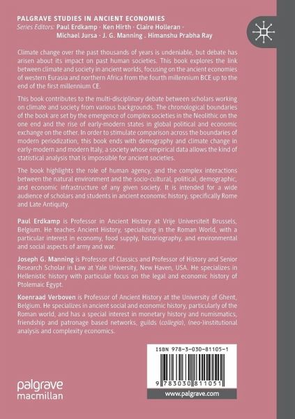 This book contributes to the multi-disciplinary debate between scholars working on climate and society from various backgrounds. The chronological boundaries of the book are set by the emergence of complex societies in the Neolithic on the one end and the rise of early-modern states in global political and economic exchange on the other. In order to stimulate comparison across the boundaries of modern periodization, this book ends with demography and climate change in early-modern and modern Italy, a society whose empirical data allows the kind of statistical analysis that is impossible for ancient societies. The book highlights the role of human agency, and the complex interactions between the natural environment and the socio-cultural, political, demographic, and economic infrastructure of any given society. It is intended for a wide audience of scholars and students in ancient economic history, specifically Rome and Late Antiquity.