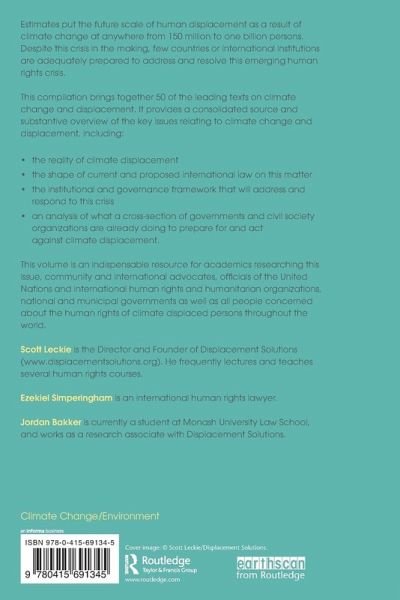 This compilation brings together fifty-one of the leading texts on climate change and displacement. It provides a consolidated source and substantive overview of the key issues relating to climate change and displacement, including: the reality of climate displacement; the shape of current and proposed international law on this matter; the institutional and governance framework that will address and respond to this crisis; and an analysis of what a cross-section of governments and civil society organizations are already doing to prepare for and act against climate displacement. This volume is an indispensable resource for academics researching this issue, community andinternational advocates, officials of the United Nations and international human rights and humanitarian organizations; national and municipal governments as well as all people concerned about the human rights of climate displaced persons throughout the world.