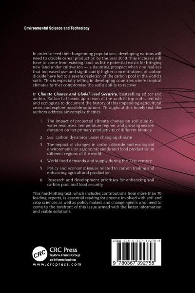 Written by a team of top soil scientists and ecologists, this book discusses the impact of projected climate change on soil quality, water resources, temperature regime, and growing season duration on net primary productivity of different biomes. It addresses soil carbon dynamics under changing climate and the impact of changes in carbon dioxide and ecological environments in agronomic yields and food production in different regions of the world. The book explores world food demands and supply during the 21st century, policy and economic issues related to carbon trading and enhancing agricultural production, and research and development priorities for enhancing soil carbon pool and food security.