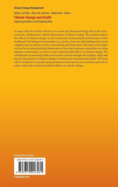 A major objective of this volume is to create and share knowledge about the socio-economic, political and cultural dimensions of climate change. The authors analyze the effects of climate change on the social and environmental determinants of the health and well-being of communities (i.e. poverty, clean air, safe drinking water, food supplies) and on extreme events such as floods and hurricanes. The book covers topics such as the social and political dimensions of the ebola response, inequalities in urban migrant communities, as well as water-related health effects of climate change. The contributors recommend political and social-cultural strategies for mitigate, adapt and prevent the impacts of climate change to human and environmental health. The book will be of interest to scholars and practitioners interested in new methods and tools to reduce risks and to increase health resilience to climate change.