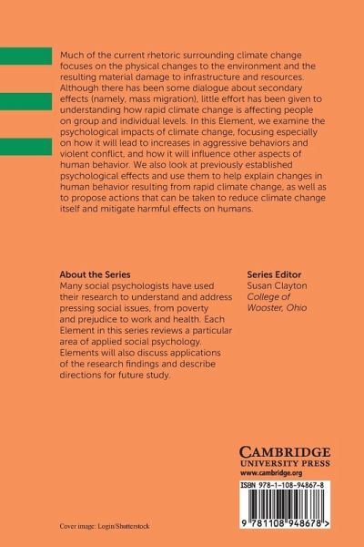 In this Element, we examine the psychological impacts of climate change, especially focused on how it will lead to increases in aggressive behaviors and violent conflict, and how it will influence other aspects of human behavior.