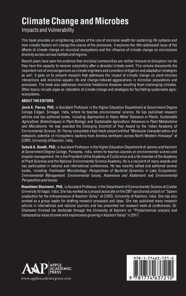 Javid A. Parray, PhD, is Assistant Professor in the Higher Education Department at Government Degree College Eidgah, Srinagar, India, where he teaches environmental science. He has published research articles and has authored books, including Approaches to Heavy Metal Tolerance in Plants; Sustainable Agriculture: Biotechniques in Plant Biology; and Sustainable Agriculture: Advances in Plant Metabolome and Microbiome. He was awarded the Emerging Scientist of Year Award by the Indian Academy of Environmental Science. Dr. Parray completed a fast-track project entitled "Molecular characterization and metabolic potential of rhizospheric bacteria from Arnebia benthamii across North Western Himalaya" at CORD, University of Kashmir, India. Suhaib A. Bandh, PhD, is Assistant Professor in the Higher Education Department of Jammu and Kashmir at Government Degree College, Pulwama, India, where he teaches courses on environmental science and disaster management. He is the President of the Academy of EcoScience and a life member of the Academy of Plant Sciences and the National Environmental Science Academy. He is a recipient of many awards and has participated in national and international conferences. He has recently edited and authored several books, including Freshwater Microbiology: Perspectives of Bacterial Dynamics in Lake Ecosystems; Environmental Management: Environmental Issues, Awareness and Abatement; and Environmental Perspectives and Issues . Nowsheen Shameem, PhD, is Assistant Professor in the Department of Environmental Science at Cluster University Srinagar, India. She has worked as a project associate on the DBT-sanctioned project on "Spawn production for the entrepreneurs of Kashmir Valley" at CORD, University of Kashmir, India. She has also worked as a group leader for drafting research proposals and ideas. She has published many research articles in international and national journals and has presented her research work at conferences. Dr. Shameem finished her doctorate through the University of Kashmir on "Phytochemical analysis and nutraceutical value of some wild mushrooms growing in Kashmir Valley" in 2017.