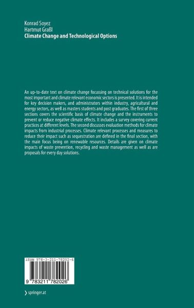 An up-to-date text on climate change focussing on technical solutions for the most important and climate relevant economic sectors is presented. It is intended for key decision makers, and administrators within industry, agricultural and energy sectors, as well as masters students and post graduates. The first of three sections covers the scientific basis of climate change and the instruments to prevent or reduce negative climate effects. It includes a survey covering current practices at different levels. The second discusses evaluation methods for climate impacts from industrial processes. Climate relevant processes and measures to reduce their impact such as sequestration are defined in the final section, with the main focus being on renewable resources. Details are given on climate impacts of waste prevention, recycling and waste management as well as are proposals for every day solutions.