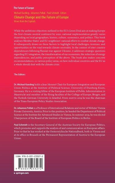 While the ambitious objectives outlined in the EU's Green Deal aim at making Europe the first climate-neutral continent by 2050, national implementation greatly varies depending on local geographies, history, culture, economics, and politics. This book analyses Member States' and EU neighbours' national efforts to combat climate change. It subsequently draws on these factors to highlight local challenges, tensions, and opportunities on the road towards climate neutrality. In the context of inter-country dependencies following Russia's war against Ukraine, it addresses strategic questions regarding EU integration, the transformation of our economies, the reduction of energy dependencies, and public perception of the above. The book also makes concrete recommendations, in various policy areas, on how individual countries and the EU as a whole should deal with the climate crisis.