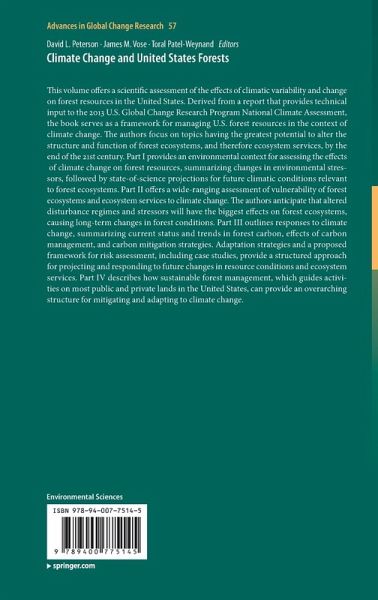 This volume offers a scientific assessment of the effects of climatic variability and change on forest resources in the United States. Derived from a report that provides technical input to the 2013 U.S. Global Change Research Program National Climate Assessment, the book serves as a framework for managing U.S. forest resources in the context of climate change. The authors focus on topics having the greatest potential to alter the structure and function of forest ecosystems, and therefore ecosystem services, by the end of the 21st century. Part I provides an environmental context for assessing the effects of climate change on forest resources, summarizing changes in environmental stressors, followed by state-of-science projections for future climatic conditions relevant to forest ecosystems. Part II offers a wide-ranging assessment of vulnerability of forest ecosystems and ecosystem services to climate change. The authors anticipate that altered disturbance regimes and stressors will have the biggest effects on forest ecosystems, causing long-term changes in forest conditions. Part III outlines responses to climate change, summarizing current status and trends in forest carbon, effects of carbon management, and carbon mitigation strategies. Adaptation strategies and a proposed framework for risk assessment, including case studies, provide a structured approach for projecting and responding to future changes in resource conditions and ecosystem services. Part IV describes how sustainable forest management, which guides activities on most public and private lands in the United States, can provide an overarching structure for mitigating and adapting to climate change.