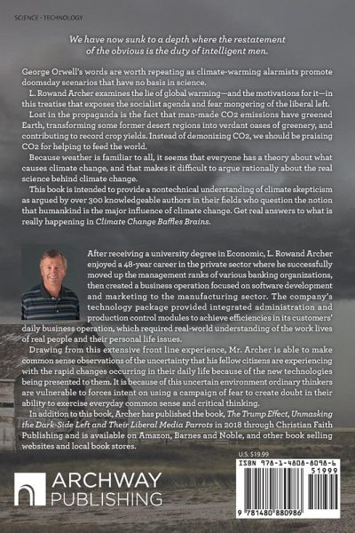 We have now sunk to a depth where the restatement of the obvious is the duty of intelligent men. George Orwell's words are worth repeating as climate-warming alarmists promote doomsday scenarios that have no basis in science. L. Rowand Archer examines the lie of global warming-and the motivations for it-in this treatise that exposes the socialist agenda and fear mongering of the liberal left. Lost in the propaganda is the fact that man-made CO2 emissions have greened Earth, transforming some former desert regions into verdant oases of greenery, and contributing to record crop yields. Instead of demonizing CO2, we should be praising CO2 for helping to feed the world. Because weather is familiar to all, it seems that everyone has a theory about what causes climate change, and that makes it difficult to argue rationally about the real science behind climate change. This book is intended to provide a nontechnical understanding of climate skepticism as argued by over 300 knowledgeable authors in their fields who question the notion that humankind is the major influence of climate change. Get real answers to what is really happening in Climate Change Baffles Brains.