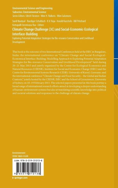This book is the outcome of two International Conferences held at the ISEC in Bangalore, India: the international conference on "Climate Change and Social-Ecological-Economical Interface-Building: Modelling Approach to Exploring Potential Adaptation Strategies for Bio-resource Conservation and Livelihood Development" held during 20-21 May 2015 and jointly organized by the Centre for Ecological Economics and Natural Resources (CEENR), Institute for Social and Economic Change (ISEC) and the Centre for Environmental Systems Research (CESR), University of Kassel, Germany; and the international conference "Climate Change and Food Security - the Global and Indian Contexts," jointly hosted by the CEENR, ISEC and the School of Geosciences, University of Sydney, on 18-19 February 2015. The selected papers presented in this book portray a broad range of international research efforts aimed at developing a deeper understanding of human-environment systems but also at translating scientific knowledge into political and societal solutions and responses to the challenge of climate change.
