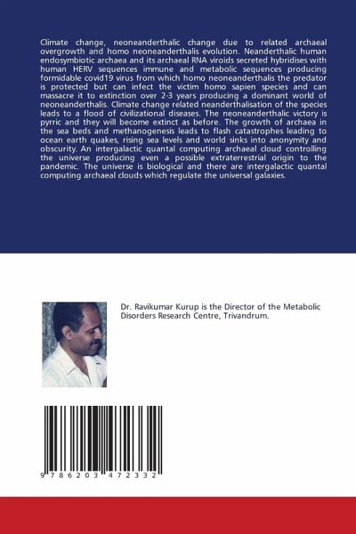 Climate change, neoneanderthalic change due to related archaeal overgrowth and homo neoneanderthalis evolution. Neanderthalic human endosymbiotic archaea and its archaeal RNA viroids secreted hybridises with human HERV sequences immune and metabolic sequences producing formidable covid19 virus from which homo neoneanderthalis the predator is protected but can infect the victim homo sapien species and can massacre it to extinction over 2-3 years producing a dominant world of neoneanderthalis. Climate change related neanderthalisation of the species leads to a flood of civilizational diseases. The neoneanderthalic victory is pyrric and they will become extinct as before. The growth of archaea in the sea beds and methanogenesis leads to flash catastrophes leading to ocean earth quakes, rising sea levels and world sinks into anonymity and obscurity. An intergalactic quantal computing archaeal cloud controlling the universe producing even a possible extraterrestrial origin to the pandemic. The universe is biological and there are intergalactic quantal computing archaeal clouds which regulate the universal galaxies.