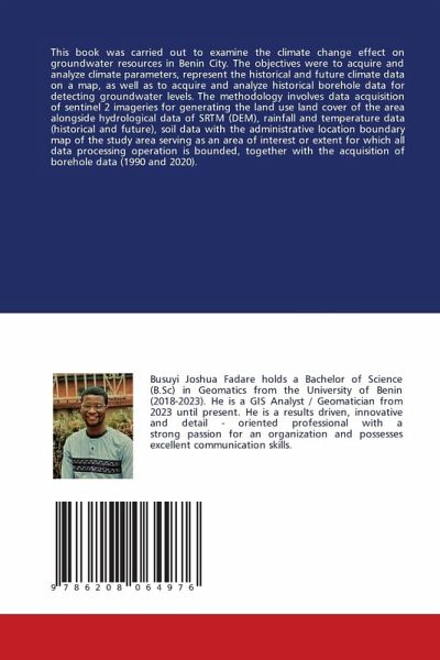 This book was carried out to examine the climate change effect on groundwater resources in Benin City. The objectives were to acquire and analyze climate parameters, represent the historical and future climate data on a map, as well as to acquire and analyze historical borehole data for detecting groundwater levels. The methodology involves data acquisition of sentinel 2 imageries for generating the land use land cover of the area alongside hydrological data of SRTM (DEM), rainfall and temperature data (historical and future), soil data with the administrative location boundary map of the study area serving as an area of interest or extent for which all data processing operation is bounded, together with the acquisition of borehole data (1990 and 2020).