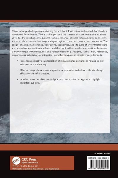 Climate change challenges are unlike any hazard that infrastructure and related shareholders have faced for millennia. These challenges, and the systems that are vulnerable to them, as well as the resulting consequences (social, economic, physical, natural, health, costs, etc.), are interrelated in countless ways and span regions, countries, oceans, and continents. The design, analysis, maintenance, operations, economics, and life cycle of civil infrastructure are dependent upon climatic effects, and this book addresses the intersections between climate change, infrastructures, and related decision paradigms, such as risk, resilience, preparedness, adaptation, or mitigation, from the viewpoint of climate change demands. Presents an objective categorization of climate change demands as related to civil infrastructure and society.Offers a comprehensive roadmap on how to plan for and address climate change effects on civil infrastructure.Includes numerous objective and practical case studies throughout to highlight important subjects.