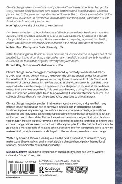Climate change is now the biggest challenge faced by humanity worldwide and ethics is the crucial missing component in the debate about what to do about this enormous threat. This book examines why thirty-five years of discussion of human-induced warming has failed to acknowledge fundamental ethical concerns, and subjects climate change's most important policy questions to ethical analysis. This book examines why ethical principles have failed to gain traction in policy formation and recommends specific strategies to ensure that climate change policies are consistent with ethical principles. Because climate change is a global problem that requires a global solution and given that many nations refuse participation due to perceived inequities in proposed international solutions, this book explains why ensuring that nations, sub-national governments, organizations, businesses and individuals acknowledge and respond to their ethical obligations is both an ethical and practical mandate. This book is the first of its kind to go beyond a mere account of relevant ethical questions to offer a pragmatic guide on how to make ethical principles influential in formulating the world's response to climate change. Written by Donald A. Brown, a leading voice in the field, it should be of interest to policy makers, and those studying environmental policy, climate change policy, international relations, environmental ethics and philosophy.