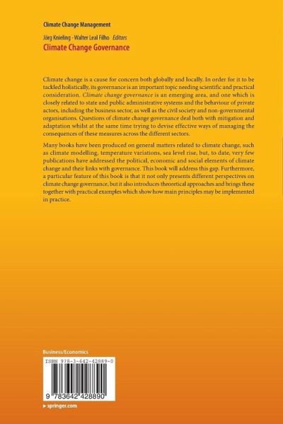 Climate change is a cause for concern both globally and locally. In order for it to be tackled holistically, its governance is an important topic needing scientific and practical consideration. Climate change governance is an emerging area, and one which is closely related to state and public administrative systems and the behaviour of private actors, including the business sector, as well as the civil society and non-governmental organisations. Questions of climate change governance deal both with mitigation and adaptation whilst at the same time trying to devise effective ways of managing the consequences of these measures across the different sectors. Many books have been produced on general matters related to climate change, such as climate modelling, temperature variations, sea level rise, but, to date, very few publications have addressed the political, economic and social elements of climate change and their links with governance. This book will address this gap. Furthermore,a particular feature of this book is that it not only presents different perspectives on climate change governance, but it also introduces theoretical approaches and brings these together with practical examples which show how main principles may be implemented in practice.