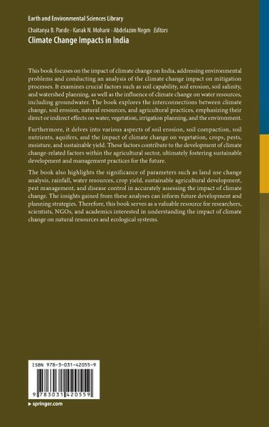 This book focuses on the impact of climate change on India, addressing environmental problems and conducting an analysis of the climate change impact on mitigation processes. It examines crucial factors such as soil capability, soil erosion, soil salinity, and watershed planning, as well as the influence of climate change on water resources, including groundwater. The book explores the interconnections between climate change, soil erosion, natural resources, and agricultural practices, emphasizing their direct or indirect effects on water, vegetation, irrigation planning, and the environment.