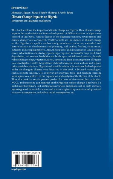 This book explores the impacts of climate change on Nigeria. How climate change impacts the productivity and future development of different sectors in Nigeria was covered in this book. Various themes of the Nigerian economy, environment, and climate change were considered. Worthy of note are the impacts of climate change on the Nigerian air quality, surface and groundwater resources, watershed and natural resources' development and planning, soil- quality, fertility, salinization, nutrients and cropping patterns. Also, the impact of climate change on land use/land cover, urbanization and strategic planning, crops and sustainable crop yield; land degradation, soil erosion, landslides and landscapes, rainfall trend patterns, drought vulnerability; ecology, vegetation/forest, carbon and biomass management of Nigeria were investigated. Finally, the problems of climate change in semi-arid and arid regions (with special emphasis on Nigeria) and possible solutions for sustainable developmentunder the changing climate were discussed in this book. Advanced technologies, such as remote sensing, GIS, multivariate analytical tools, and machine learning techniques, were utilized in the exploration and analysis of the themes of this book. Thus, this book is a very important product for point of view researchers, scientists, NGOs, and university communities on the Nigerian climate change. This book is a useful interdisciplinary tool, cutting across various disciplines such as earth sciences, hydrology, environmental sciences, soil science, engineering, remote sensing, natural resources management, and public health management, etc.