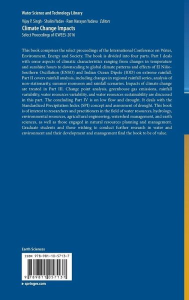 1. Trends in Temperature for the Himalayan Environment of Leh (Jammu and Kashmir), India, by Rohitashw Kumar.- 2. Changes in Sunshine Duration in Humid Environments of Agartala (Tripura), India, by D. Jhajharia.- 3. Application of Multiple Linear Regression as Downscaling Methodology for Lower Godavari Basin, by Gayam Akshara.- 4. Statistical Downscaling of Minimum Temperature of Raipur (C.G.) India, by R.K. Jaiswal.- 5. Statistical Downscaling of Daily Temperature and Precipitation Data from Coupled Model Inter-Comparison Project 5 (CMIP5)-RCPs Experiment: In Weyib River Basin, Southeastern Ethiopia, by Abdulkerim Bedewi Serur.- 6. Global Climate Pattern Behind Hydrological Extremes in Central India, by Kironmala Chanda.- 7. Changes in ENSO and IOD Effects on the Extreme Rainfall of Hyderabad City, India, by V. Agilan.- 8. Detecting Changes in Regional Rainfall Series in India using Binary Segmentation based Multiple Change-pointDetection Techniques, by Shagufta Akbari.- 9. AnalyzingNon-stationarity in the Hyderabad City Rainfall Intensity-Duration-Frequency Curves, by V. Agilan.- 10. Development of Finer Resolution Rainfall Scenario for Kangsabati Catchment and Command, by P. M. Dhage.- 11. Investigation of the Relationship Between Natural Aerosols and Indian Summer Monsoon Rainfall Using a Climate Model, by Charu Singh.- 12. Change Point Analysis of Air Temperature in India, by Chithra N R. 13. Greenhouse Gas Emissions from Sewage Treatment Plants Based on Sequential Batch Reactor in Maharashtra, by Vipin Singh.- 14. Study of Climate Change in Uttarakhand Himalayas: Changing Patterns of Historical Rainfall, by Archana Sarkar.- 15. The Impact of Climate Change on Rainfall Variability: A Study in Central Himalayas, by L. N. Thakural.- 16. Estimation of Changes in Annual Peak Flows in Netravathi River Basin, Karnataka, India by Fasnamol T M.- 17. Potential Impacts of Climate Change on Water Resources in Semi-Arid Region of Chittorgarh, India, by Ajit Pratap Singh.-18. Water Availability under Changing Climate Scenario in Ur River Basin, by Thomas T..- 19. Water Sustainability Assessment Under Climatic Uncertainty- A Case Study of Chhattisgarh (India), by Surendra Kumar Chandniha.- 20. Coupling of Tennant concept with Standardized Precipitation Index (SPI) for the prediction of environmental flow condition from rainfall in Upper Narmada basin, by Kumar Amrit.- 21. Assessment of Drought in Balangir District of Odisha, India Using Drought Indices, by A. Sudarsan Rao.- 22. Impact Of Hfc Fire Extinguishing Clean Agents On Climate Change And Its System Design Requirements For Fire Hazards In India- A Brief Study.