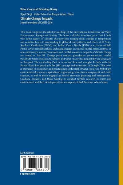 1. Trends in Temperature for the Himalayan Environment of Leh (Jammu and Kashmir), India, by Rohitashw Kumar.- 2. Changes in Sunshine Duration in Humid Environments of Agartala (Tripura), India, by D. Jhajharia.- 3. Application of Multiple Linear Regression as Downscaling Methodology for Lower Godavari Basin, by Gayam Akshara.- 4. Statistical Downscaling of Minimum Temperature of Raipur (C.G.) India, by R.K. Jaiswal.- 5. Statistical Downscaling of Daily Temperature and Precipitation Data from Coupled Model Inter-Comparison Project 5 (CMIP5)-RCPs Experiment: In Weyib River Basin, Southeastern Ethiopia, by Abdulkerim Bedewi Serur.- 6. Global Climate Pattern Behind Hydrological Extremes in Central India, by Kironmala Chanda.- 7. Changes in ENSO and IOD Effects on the Extreme Rainfall of Hyderabad City, India, by V. Agilan.- 8. Detecting Changes in Regional Rainfall Series in India using Binary Segmentation based Multiple Change-pointDetection Techniques, by Shagufta Akbari.- 9. AnalyzingNon-stationarity in the Hyderabad City Rainfall Intensity-Duration-Frequency Curves, by V. Agilan.- 10. Development of Finer Resolution Rainfall Scenario for Kangsabati Catchment and Command, by P. M. Dhage.- 11. Investigation of the Relationship Between Natural Aerosols and Indian Summer Monsoon Rainfall Using a Climate Model, by Charu Singh.- 12. Change Point Analysis of Air Temperature in India, by Chithra N R. 13. Greenhouse Gas Emissions from Sewage Treatment Plants Based on Sequential Batch Reactor in Maharashtra, by Vipin Singh.- 14. Study of Climate Change in Uttarakhand Himalayas: Changing Patterns of Historical Rainfall, by Archana Sarkar.- 15. The Impact of Climate Change on Rainfall Variability: A Study in Central Himalayas, by L. N. Thakural.- 16. Estimation of Changes in Annual Peak Flows in Netravathi River Basin, Karnataka, India by Fasnamol T M.- 17. Potential Impacts of Climate Change on Water Resources in Semi-Arid Region of Chittorgarh, India, by Ajit Pratap Singh.-18. Water Availability under Changing Climate Scenario in Ur River Basin, by Thomas T..- 19. Water Sustainability Assessment Under Climatic Uncertainty- A Case Study of Chhattisgarh (India), by Surendra Kumar Chandniha.- 20. Coupling of Tennant concept with Standardized Precipitation Index (SPI) for the prediction of environmental flow condition from rainfall in Upper Narmada basin, by Kumar Amrit.- 21. Assessment of Drought in Balangir District of Odisha, India Using Drought Indices, by A. Sudarsan Rao.- 22. Impact Of Hfc Fire Extinguishing Clean Agents On Climate Change And Its System Design Requirements For Fire Hazards In India- A Brief Study.