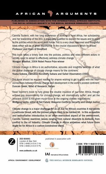 Climate change is a major challenge for us all, but for African countries it represents a particular threat. This book outlines current thinking and evidence and the impact such change will have on Africa's development prospects. Global warming above the level of two degrees Celsius would be enormously damaging for poorer parts of the world, leading to crises with crops, livestock, water supplies and coastal areas. Within Africa, it's likely to be the continent's poorest people who are hit hardest. In this accessible and authoritative introduction to an often-overlooked aspect of the environment, Camilla Toulmin uses case studies to look at issues ranging from natural disasters to biofuels, and from conflict to the oil industry. Finally, the book addresses what future there might be for Africa in a carbon-constrained world.