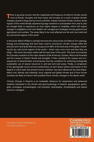 Reconstructing climatic changes in deserts and their margins at a variety of scales in space and time, this book draws upon evidence from land and sea, including desert dunes, wind-blown dust, river and lake sediments, glacial moraines, plant and animal fossils, isotope geochemistry, speleothems, soils, and prehistoric archaeology. The book summarises the Cenozoic evolution of the major deserts of the Americas, Eurasia, Africa and Australia, and the causes of historic floods and droughts. The book then considers the causes and consequences of desertification and proposes four key conditions for achieving ecologically sustainable use of natural resources in arid and semi-arid areas. Climate Change in Deserts is an invaluable reference for researchers and advanced students interested in the climate and geomorphology of deserts: geographers, geologists, ecologists, archaeologists, soil scientists, hydrologists, climatologists and natural resource managers.