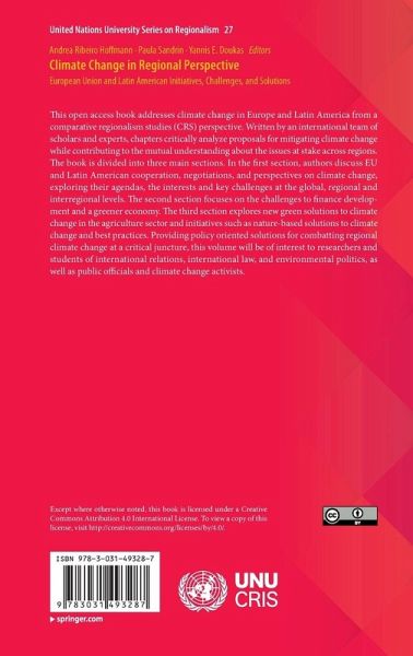 This Open Access book addresses climate change in Europe and Latin America from a comparative regionalism studies (CRS) perspective. Written by an international team of scholars and experts, chapters critically analyze proposals for mitigating climate change while contributing to the mutual understanding about the issues at stake across regions. The book is divided into three main sections. In the first section, authors discuss EU and Latin American cooperation, negotiations, and perspectives on climate change, exploring their agendas, the interests and key challenges at the global, regional and interregional levels. The second section focuses on the challenges to finance development and a greener economy. The third section explores new green solutions to climate change in the agriculture sector and initiatives such as nature-based solutions to climate change and best practices. Providing policy oriented solutions for combatting regional climate change at a critical juncture,this volume will be of interest to researchers and students of international relations, international law, and environmental politics, as well as public officials and climate change activists.