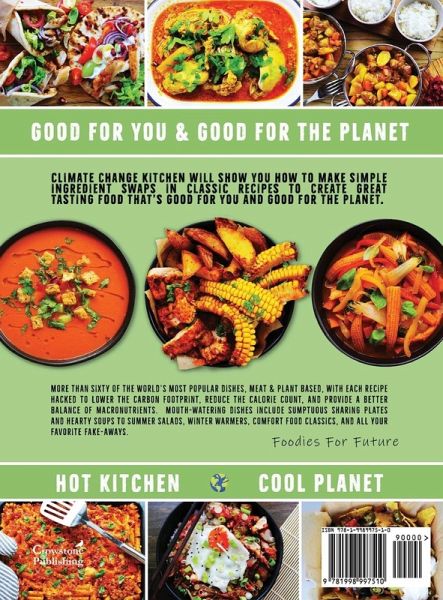 CLIMATE CHANGE KITCHEN will show you how simple ingredient swaps in your favorite recipes can create great tasting food that's good for you and good for the planet. Meat & Plant Based - Reduced Calorie - Simple Cooking Sixty-five of the world's most popular dishes, both meat and plant-based, with each recipe hacked to lower the carbon footprint, reduce the calorie count, and provide a better balance of nutrients with no compromise on taste. The World's Best Recipes - For a Low-Carbon Future Mouth-watering recipes include sumptuous sharing plates and hearty soups to summer salads, winter warmers, comfort food classics, soul bowls, and all your favorite fake-aways. Hot Kitchen - Cool Planet Our recipes have, on average, a 75% lower carbon footprint, 20% fewer calories, and 40% less fat with the same serving size and amazing taste. Cook each of the 65 recipes in this book once (instead of the traditional recipes) and you will avoid half a tonne of green-house gas emissions. Good For You - Good For The Planet All of the recipes come with data on the carbon footprint, calorie count, nutritional labelling and a breakdown of protein, fat, & carbohydrates. Each of our "hacked" recipes is compared to the original recipe to help you understand the big impact just a few small changes can make. Supporting better food choices for you and for the planet. Climate Kitchen Hacks As you make your way through the book you will learn to cook the Climate Change Kitchen way, with advice and guidance on how to:Turbo-charge plant-based content with no compromise on taste, Select the lowest carbon footprint types (and cuts) of meat, Choose the most sustainable seafood, Make smart use of cheese, yogurt, and milk, Adapt cooking techniques to reduce emissions, Create no fuss, great tasting, everyday classic dishes first time and every time. Recipes Include:Loaded Nachos with Cashew Melt Pulled Pork & Jackfruit Sliders Pecan Veggie Rolls Quesadillas with Sweet Potato Melt Yakitori Chicken Skewers Lean Chicken Koftas Wholesome Beetroot Frittata Gobi Manchurian Cauliflower Zingy Gazpacho Soup Tangy Shellfish Tom Yum Luscious Laksa Hearty Harira Soup Chicken Caesar Salad Minted Greek Salad Beetroot Niçoise Salad Waldorf Salad Avocado Caprese Salad Spicy Thai Tuna Salad Sweet Papaya Thai Salad Not-Fried Chicken Burgers Ham-Burger & Fries Three Cheese Mac & Cheese Piri Piri Chicken & Corn Cutlets Smoky Chicken Fajitas Spicy Bean Burritos Light & Crispy Tonkatsu Pork Pork Bolognese Classic Pasta Carbonara Summer Veggie Lasagna Tuna Pasta Bake with a Parmesan Crunch Pasta Puttanesca Pasta Alla Norma Smoky Pork Chili Crispy Crumb Cassoulet Chicken, Leek, and Sweet Potato Pie Aromatic Vegetable Tagine Lighter Moussaka Chicken Tikka Masala Korma Curry Cauliflower & Coconut Jalfrezi Japanese Curry Rice Crispy Aubergine Katsu Curry Chicken Rendang Curry Veggie Thai Red Curry Bunny Chow Shiitake Chow Mein Kung Pao Chicken Lean Sweet & Sour Chicken Scallop Pad Thai Chicken Gyros Yakisoba Chicken Easy Scallop Risotto Simple Seafood Paella Smoky Mackerel Kedgeree Chicken Biryani Crispy Pork Ramen Bowl Bibimbap