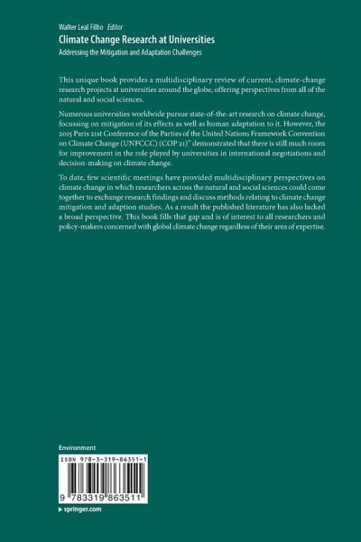 Part 1- Research and Education on Climate Change Mitigation.- Integrating farmer's traditional knowledge and practices into climate change sectoral development planning: Case studies from India.- Roof top farming a solution to food security and climate change adaptation for cities.- Modeling and monitoring of air quality in Greater Cairo Region, Egypt using Landsat-8 images, HYSPLIT and GIS based analysis.- Going Fossil Free: A Lesson in Climate Activism and Collective Responsibility.- Philippine Higher Education Institutions' Responses to Climate Change.- Adapting Sri Lanka to Climate Change: approaches to water modelling in the Upper Mahaweli Catchment Area.- The Challenges and Opportunities for Higher Education Institutions at the Science-Policy Interface.- Study of the vulnerability of basic social infrastructure of the Mexico´s north border for purposes of resiliency and adaptation to the adverse effects of climate change.- Climate Change Mitigation and Adaptation Studies in Nigeria Universities: Achievements, Challenges and Prospects.- Landslide Loss and Damage in Darbung Village, Gorkha District, Nepal.- Adaptations to Climate Change in Bangladesh: Development of a National Inventory.- Implementing Heat-Related Adaptation Measures in the Tri-City Area Bergisches Städtedreieck.- Legacy of authoritative environmentalism and path-dependent historic institutionalism in the climate change policy dynamics of the Maldives.- Part 2- Research and Education on Climate Change Adaptation.- Community-based Adaptation to Climate Change in Egypt - Status Quo and Future Policies.- Climate change and Extremes over Dabaa Region, Egypt.- Climate change adaptation in yam and cassava production, Cross River State, Nigeria: The role of higher educational institutions.- Change and analysis of extreme rainfall indices during 1960-2010 and 2011-2100 in Abidjan District (Cote D'ivoire).- Climate Change Mitigation and Adaptation in Higher Education Institutions: The Case Study of the Faculty of Physical and Mathematical Sciences at the University of Chile.