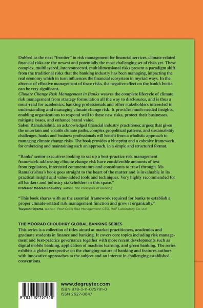 Saloni Ramakrishna, an acknowledged financial industry practitioner, argues that given the uncertain and volatile climate paths, complex geopolitical patterns, and sustainability challenges, banks and business professionals will benefit from a wholistic approach to managing climate change risks. The book provides a blueprint and a cohesive framework for embracing and maintaining such an approach, in a simple and structured format.