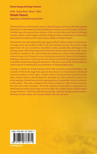 This book focuses on the frontier issues in climate finance and aims to develop a general framework to understand the financial pathways towards a successful energy transition. It builds upon the general descriptions of the current status and future challenges towards carbon neutral targets, and then bring forward a combination of theoretical and empirical analysis on the critical issues related to climate finance.