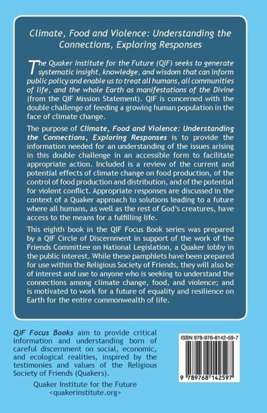 The purpose of Climate, Food and Violence: Understanding the Connections, Exploring Responses is to provide the information needed for an understanding of the issues arising in this double challenge in an accessible form to facilitate appropriate action. Included is a review of the current and potential effects of climate change on food production, of the control of food production and distribution, and of the potential for violent conflict. Appropriate responses are discussed in the context of a Quaker approach to solutions leading to a future where all humans, as well as the rest of God's creatures, have access to the means for a fulfilling life.