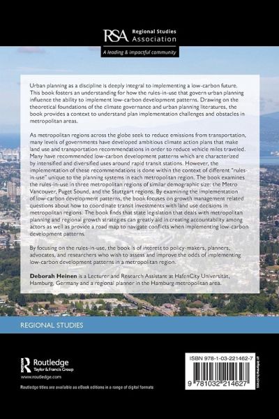 As metropolitan regions across the globe seek to reduce emissions from transportation, many levels of governments have developed ambitious climate action plans that make land use and transportation recommendations in order to reduce vehicle miles traveled. Many have recommended low-carbon development patterns which are characterized by intensified and diversified uses around rapid transit stations. However, the implementation of these recommendations is done within the context of different "rules-in-use" unique to the planning systems in each metropolitan region. The book examines the rules-in-use in three metropolitan regions of similar demographic size: the Metro Vancouver, Puget Sound, and the Stuttgart regions. By examining the implementation of low-carbon development patterns, the book focuses on growth management related questions about how to coordinate transit investments with land use decisions in metropolitan regions. The book finds that state legislation that deals with metropolitan planning and regional growth strategies can greatly aid in creating accountability among actors as well as provide a road map to navigate conflicts when implementing low-carbon development patterns.