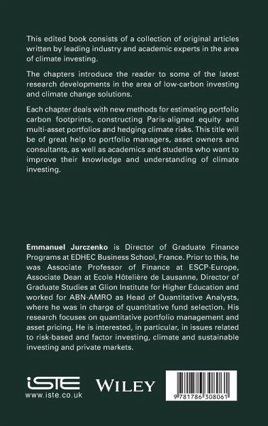 This edited book consists of a collection of original articles written by leading industry and academic experts in the area of climate investing. The chapters introduce the reader to some of the latest research developments in the area of low-carbon investing and climate change solutions. Each chapter deals with new methods for estimating portfolio carbon footprints, constructing Paris-aligned equity and multi-asset portfolios and hedging climate risks. This title will be of great help to portfolio managers, asset owners and consultants, as well as academics and students who want to improve their knowledge and understanding of climate investing.