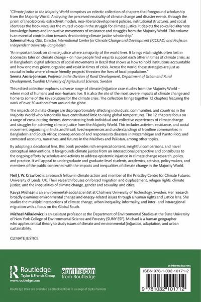 By adopting a decolonial lens, this book provides rich empirical content, insightful comparisons, and novel conceptual interventions. It foregrounds climate justice from an intersectional perspective and contributes to the ongoing efforts by scholars and activists to address epistemic injustice in climate change research, policy, and practice. It will appeal to undergraduate and graduate-level students, academics, activists, policymakers, and members of the public concerned with the impacts and inequalities of climate change in the Majority World.