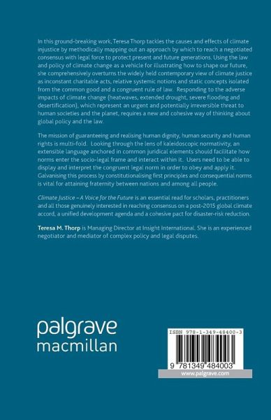 In this ground-breaking work, Teresa Thorp tackles the causes and effects of climate injustice by methodically mapping out an approach by which to reach a negotiated consensus with legal force to protect present and future generations. Using the law and policy of climate change as a vehicle for illustrating how to shape our future, she comprehensively overturns the widely held contemporary view of climate justice as inconstant charitable acts, relative systemic notions and static concepts isolated from the common good and a congruent rule of law. Responding to the adverse impacts of climate change (heat waves, extended drought, severe flooding and desertification), which represent an urgent and potentially irreversible threat to human societies and the planet, requires a new and cohesive way of thinking about global policy and the law. The mission of guaranteeing and realising human dignity, human security and human rights is multi-fold. Looking through the lens of kaleidoscopic normativity, an extensible language anchored in common juridical elements should facilitate how norms enter the socio-legal frame and interact within it. Users need to be able to display and interpret the congruent legal norm in order to obey and apply it. Galvanising this process by constitutionalising first principles and consequential norms is vital for attaining fraternity between nations and among all people. Climate Justice ¿ A Voice for the Future is an essential read for scholars, practitioners and all those genuinely interested in reaching consensus on a post-2015 global climate accord, a unified development agenda and a cohesive pact for disaster-risk reduction.