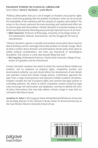 Climate Liberalism examines the potential and limitations of classical-liberal approaches to pollution control and climate change. Some successful environmental strategies, such as the use of catch-shares for fisheries, instream water rights, and tradable emission permits, draw heavily upon the classical liberal intellectual tradition and its emphasis on property rights and competitive markets. This intellectual tradition has been less helpful, to date, in the development or design of climate change policies.