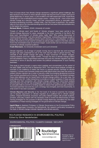 This study is done through a macro-micro analysis and concentrates on the period of the early 2000s until the end of September 2014. The macro-level analysis provides an overview of the coalitions of states that favour or oppose security framings on climate migration. It shows how European states and the Small Island States have been key actors to present climate migration as a matter of security, while the emerging developing countries have actively opposed such a framing. The book argues that much of the division between these states alliances can be traced back to climate change politics. As a next step, the book delves into UK-India interactions to provide an in-depth analysis of these security framings and their connection with climate change politics. This micro-level analysis demonstrates how the UK has strategically used security framings on climate migration to persuade India to commit to binding targets to reduce their greenhouse gas emissions. The book examines how and why such a strategy has emerged, and most importantly, to what extent it has been successful.