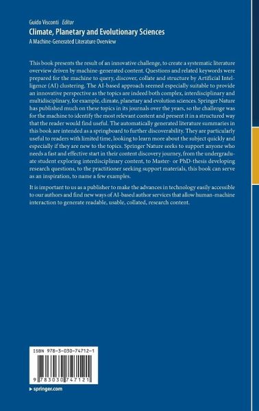 This book presents the result of an innovative challenge, to create a systematic literature overview driven by machine-generated content. Questions and related keywords were prepared for the machine to query, discover, collate and structure by Artificial Intelligence (AI) clustering. The AI-based approach seemed especially suitable to provide an innovative perspective as the topics are indeed both complex, interdisciplinary and multidisciplinary, for example, climate, planetary and evolution sciences. Springer Nature has published much on these topics in its journals over the years, so the challenge was for the machine to identify the most relevant content and present it in a structured way that the reader would find useful. The automatically generated literature summaries in this book are intended as a springboard to further discoverability. They are particularly useful to readers with limited time, looking to learn more about the subject quickly and especially if they are new to the topics. Springer Nature seeks to support anyone who needs a fast and effective start in their content discovery journey, from the undergraduate student exploring interdisciplinary content, to Master- or PhD-thesis developing research questions, to the practitioner seeking support materials, this book can serve as an inspiration, to name a few examples. It is important to us as a publisher to make the advances in technology easily accessible to our authors and find new ways of AI-based author services that allow human-machine interaction to generate readable, usable, collated, research content.
