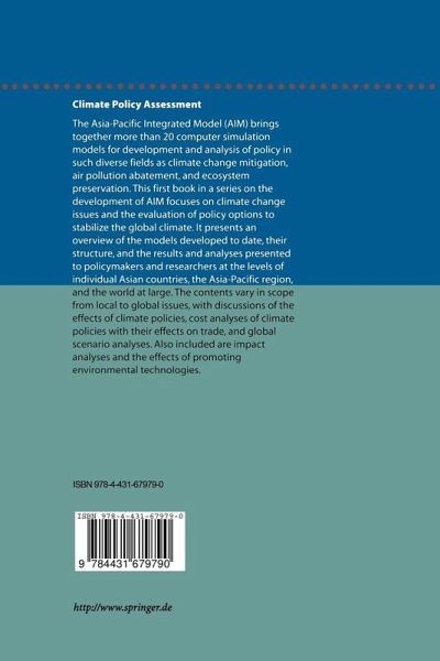 The Asia-Pacific Integrated Model (AIM) brings together more than 20 computer simulation models for development and analysis of policy in such diverse fields as climate change mitigation, air pollution abatement, and ecosystem preservation. This first book in a series on the development of AIM focuses on climate change issues and the evaluation of policy options to stabilize the global climate. It presents an overview of the models developed to date, their structure, and the results and analyses presented to policymakers and researchers at the levels of individual Asian countries, the Asia-Pacific region, and the world at large. The contents vary in scope from local to global issues, with discussions of the effects of climate policies, cost analyses of climate policies with their effects on trade, and global scenario analyses. Also included are impact analyses and the effects of promoting environmental technologies.