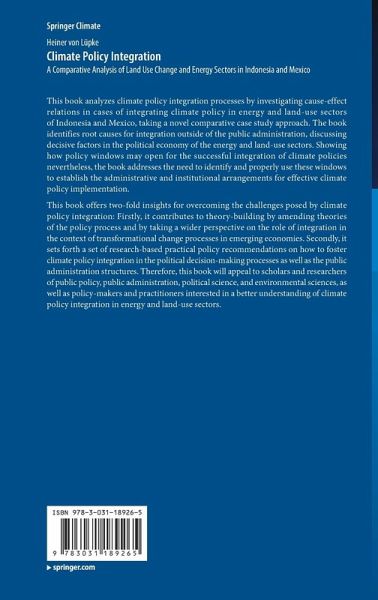 This book analyzes climate policy integration processes by investigating cause-effect relations in cases of integrating climate policy in energy and land-use sectors of Indonesia and Mexico, taking a novel comparative case study approach. The book identifies root causes for integration outside of the public administration, discussing decisive factors in the political economy of the energy and land-use sectors. Showing how policy windows may open for the successful integration of climate policies nevertheless, the book addresses the need to identify and properly use these windows to establish the administrative and institutional arrangements for effective climate policy implementation. This book offers two-fold insights for overcoming the challenges posed by climate policy integration: Firstly, it contributes to theory-building by amending theories of the policy process and by taking a wider perspective on the role of integration in the context of transformational change processes in emerging economies. Secondly, it sets forth a set of research-based practical policy recommendations on how to foster climate policy integration in the political decision-making processes as well as the public administration structures. Therefore, this book will appeal to scholars and researchers of public policy, public administration, political science, and environmental sciences, as well as policy-makers and practitioners interested in a better understanding of climate policy integration in energy and land-use sectors.
