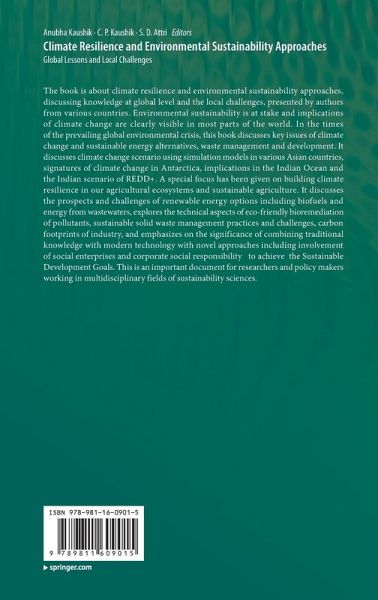 The book is about climate resilience and environmental sustainability approaches, discussing knowledge at global level and the local challenges, presented by authors from various countries. Environmental sustainability is at stake and implications of climate change are clearly visible in most parts of the world. In the times of the prevailing global environmental crisis, this book discusses key issues of climate change and sustainable energy alternatives, waste management and development. It discusses climate change scenario using simulation models in various Asian countries, signatures of climate change in Antarctica, implications in the Indian Ocean and the Indian scenario of REDD+. A special focus has been given on building climate resilience in our agricultural ecosystems and sustainable agriculture. It discusses the prospects and challenges of renewable energy options including biofuels and energy from wastewaters, explores the technical aspects of eco-friendly bioremediation of pollutants, sustainable solid waste management practices and challenges, carbon footprints of industry, and emphasizes on the significance of combining traditional knowledge with modern technology with novel approaches including involvement of social enterprises and corporate social responsibility to achieve the Sustainable Development Goals. This is an important document for researchers and policy makers working in multidisciplinary fields of sustainability sciences.