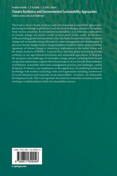 The book is about climate resilience and environmental sustainability approaches, discussing knowledge at global level and the local challenges, presented by authors from various countries. Environmental sustainability is at stake and implications of climate change are clearly visible in most parts of the world. In the times of the prevailing global environmental crisis, this book discusses key issues of climate change and sustainable energy alternatives, waste management and development. It discusses climate change scenario using simulation models in various Asian countries, signatures of climate change in Antarctica, implications in the Indian Ocean and the Indian scenario of REDD+. A special focus has been given on building climate resilience in our agricultural ecosystems and sustainable agriculture. It discusses the prospects and challenges of renewable energy options including biofuels and energy from wastewaters, explores the technical aspects of eco-friendly bioremediation of pollutants, sustainable solid waste management practices and challenges, carbon footprints of industry, and emphasizes on the significance of combining traditional knowledge with modern technology with novel approaches including involvement of social enterprises and corporate social responsibility to achieve the Sustainable Development Goals. This is an important document for researchers and policy makers working in multidisciplinary fields of sustainability sciences.