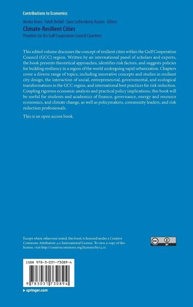 This edited volume discusses the concept of resilient cities within the Gulf Cooperation Council (GCC) region. Written by an international panel of scholars and experts, the book presents theoretical approaches, identifies risk factors, and suggests policies for building resiliency in a region of the world undergoing rapid urbanization. Chapters cover a diverse range of topics, including innovative concepts and studies in resilient city design, the interaction of social, entrepreneurial, governmental, and ecological transformations in the GCC region, and international best practices for risk reduction. Coupling rigorous economic analysis and practical policy implications, this book will be useful for students and academics of finance, governance, energy and resource economics, and climate change, as well as policymakers, community leaders, and risk reduction professionals.
