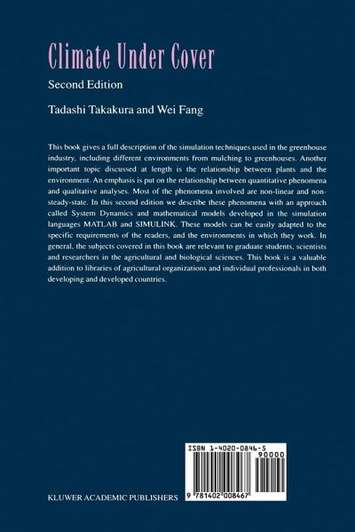 1. Introduction.- 1.1. Introduction.- 1.2. Europe and America.- 1.3. Asia.- 1.4. Africa and Middle Easy.- 1.5. Japan.- Problems.- 2. Definition of Covering and Properties of Covering Materials.- 2.1 Introduction.- 2.2 Mulching.- 2.3 Roe covers (Tunnels).- 2.4 Floating mulches (Floating row cover).- 2.5 Rain shelters.- 2.6 Unheated greenhouses.- 2.7 Covering materials.- Problems.- 3. Digital Simulation.- 3.1. Introduction.- 3.2. System dynamics.- 3.3. Simulation languages.- 3.4. Digital simulation by CSMP and MATLAB.- 3.5. Model structure and representation.- 3.6. A Model for temperature regimes in the soil (CUC01).- 3.7. Application to steady state models.- 3.8. More on MATLAB.- 3.9. SIMULINK.- Problems.- 4. Heat Balance of Bare Ground.- 4.1. Introduction.- 4.2. Convective heat transfer.- 4.3. A model with solar radiation and air temp. boundary condition (CUC02).- 4.4. Mass transfer.- 4.5. A model with latent heat transfer (CUC03).- 4.6. Radiation balance.- 4.7. Long wave radiation.- Problems.- 5. Solar Radiation Environment.- 5.1. Introduction.- 5.2. Units of radiation and light.- 5.3. Solar radiation properties of covering materials.- 5.4. Calcualtion of transmissivity (CUC04).- 5.5. Solar radiation.- 5.6. The sun's altitude and azimuth.- Problems.- 6. Temperature Environment Under Cover.- 6.1. Introduction.- 6.2. Effect of mulching.- 6.3. Temperature environment under row covers (CUC30).- 6.4. Double layer greenhouse model (CUC50).- 6.5. A pad and fan greenhouse model (CUC35).- Problems.- 7. CO2 Environment.- 7.1. Introduction.- 7.2. CO2 concentration in soil layer (CUC70).- 7.3. Program execution and output.- 7.4. CO2 concentration in a plastic house and ventilation.- 7.5. One dimensional interpolation.- Problems.- 8. Water and Water Vapor Environment.- 8.1.Introduction.- 8.2. Water and water vapor movement in soil.- 8.3. Water and heat balance in soil layer (CUC90).- 8.4. Interaction between water movement and heat flow.- Problems.- 9. Control Function.- 9.1. Introduction.- 9.2. System response.- 9.3. PID control.- 9.4. Temperature control logic (CUC120).- 9.5. Feedback vs. feedforward control.- Problems.- 10. Plant Response to the Environment.- 10.1. Introduction.- 10.2. Plant photosynthesis and respiration.- 10.3. Energy balance of a plant leaf.- 10.4. Stomata resistance of plant (CUC151).- 10.5. Plant growth model.- Problems.- References.