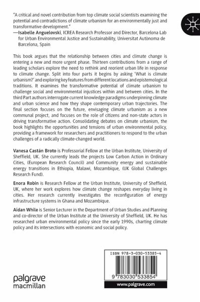 Chapter 1. Introduction. Climate Urbanism: towards a critical research agenda; Vanesa Castán Broto, Enora Robin and Aidan While.- PART 1: What is climate urbanism?.- Chapter 2. For a minor perspective on climate urbanism: towards a decolonial research praxis; Enora Robin, Linda Westman and Vanesa Castán Broto.- Chapter 3. Climate urbanism and the implications for the climate apartheid; Joshua Long, Jennifer L. Rice and Anthony Levenda.- Chapter 4. New Climate Urbanism or Old Capitalism with climate characteristics?; Linda Shi.- Chapter 5. Understanding the governance of a New Climate Urbanism; Sirkku Juhola.- PART 2: Climate urbanism and transformative action.- Chapter 6. Urban climate imaginaries and climate urbanism; Linda Westman and Vanesa Castán Broto.- Chapter 7. Institutional dynamics of transformative climate urbanism: remaking rules in messy contexts; James Patterson.- Chapter 8. Urban resilience and the politics of development; Eric Chu.- Chapter 9. Two cheers for 'entrepreneurial climate urbanism' in the conservative city; Corina McKendry.- PART 3: The knowledge politics of climate urbanism.- Chapter 10. An adaptation agenda for the new climate urbanism: global insights; Marta Olazabal.- Chapter 11. The New Climate Urbanism: a physical, social, and behavioural framework; Luna Khirfan.- Chapter 12. Collaborative education as a 'New (urban) Civil Politics of climate change'; Andrew Kythreotis and Theresa Mercer.- PART 4: Climate urbanism as a new communal project.- Chapter 13 Community energy resilience for a New Climate Urbanism; Long Seng To.- Chapter 14. Making climate urbanism from the grassroots: eco-communities, experiments and divergent temporalities; Jenny Pickerill.- Chapter 15. Conclusions. Three modalities for a New Climate Urbanism; Vanesa Castán Broto, Enora Robin and Aidan While.