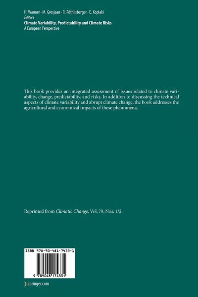 Introduction: Climate Variability, Predictability, and Climate Risks: A European Perspective (H. Wanner, M. Grosjean, R. Rothlisberger, E. Xoplaki).- Climate Variability - Observations, Reconstructions, and Model Simulations for the Atlantic-European and Alpine region from 1500-2100 AD (C. C. Raible, C. Casty, J. Luterbacher, A. Pauling, J. Esper, D. C. Frank, U. Buntgen, A. C. Roeschz, P. Tschuck, M. Wild, P.-L. Vidale, C. Schar, H. Wanner).- Challenges posed by and Approaches to the study of Seasonal-to-Decadal Climate Variability (C. Schwierz, C. Appenzeller, H. C. Davies, M. A. Liniger, W. Muller, T. F. Stocker, M. Yoshimori).- Global Warming and the Summertime Evapotranspiration Regime of the Alpine Region (P. Calanca, A. Rosch, K. Jasper, M. Wild).- Climate Risks and their Impact on Agriculture and Forests in Switzerland (J. Fuhrer, M. Beniston, A. Fischlin, Ch. Frei, S. Goyette, K. Jasper, Ch. Pfister).- The Coupling of Optimal Economic Growth and Climate Dynamics (O. Bahn, L. Drouet, N. R. Edwards, A. Haurie, R. Knutti, S. Kypreos, T. F. Stoker, J.-P. Vial).- Modeling Endogenous Learning and Imperfect Competition Effects in Climate Change Economics (L. Viguier, L. Barreto, A. Haurie, S. Kypreos, P. Rafaj).- Economics of Climate Policy and Collective Decision Making (B. Burgenmeier, A. Baranzini, C. Ferrier, C. Germond-Duret, K. Ingold, S. Perret, P. Rafaj, S. Kypreos, A. Wokaun)